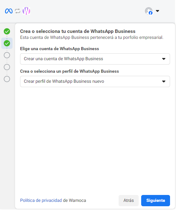 If you do not yet have a company portfolio, select ‘*Create a company portfolio*’. The following screen will appear. If you have a WhatsApp Business account select it, if not, select that you want to create a WhatsApp Business account and click ‘*Next*’.