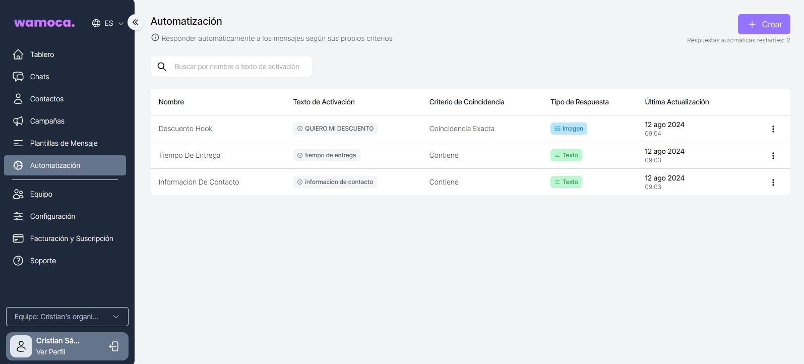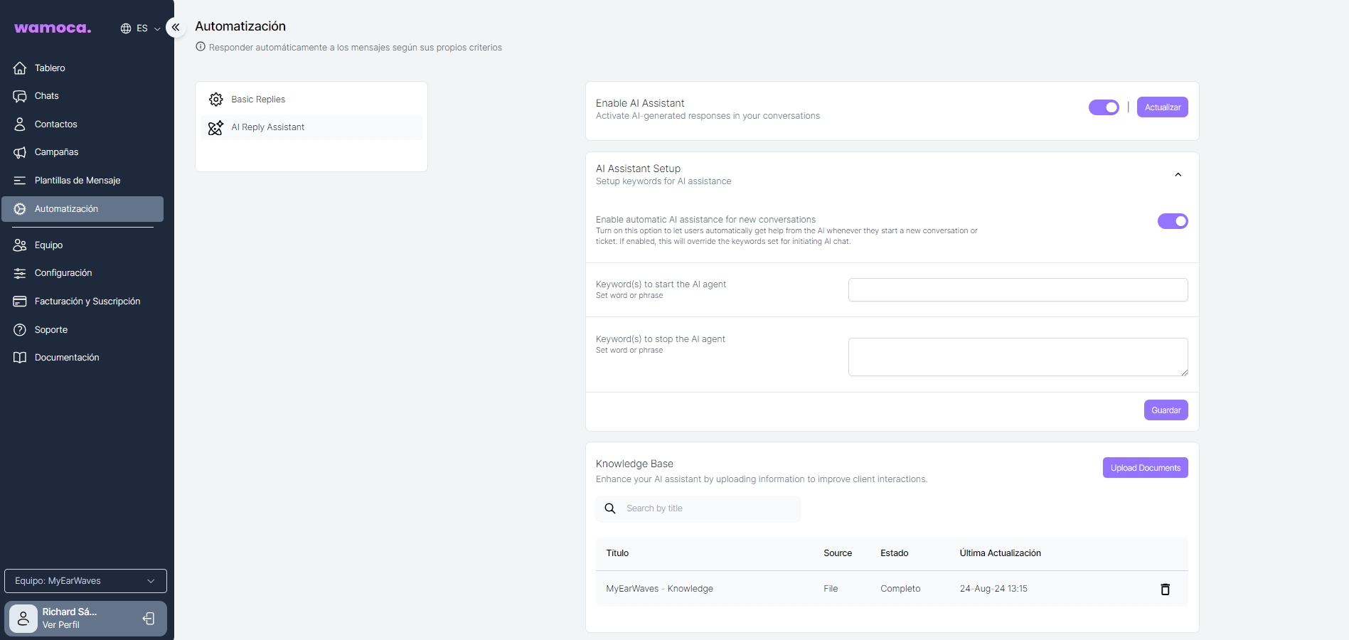 This type of automation uses Artificial Intelligence and will automatically reply to customers based on a knowledge document to be uploaded. The aim of this feature is to improve the user experience, streamline communication and provide timely assistance without manual intervention in more detail than basic automations.