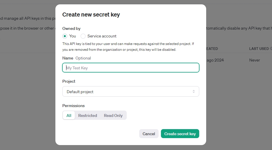 The next thing to do is to create the API key. Click on the ‘Create new secret key’ button and a screen will appear where you will have to add the name (optional, it can be the name of your business) and the project (default):