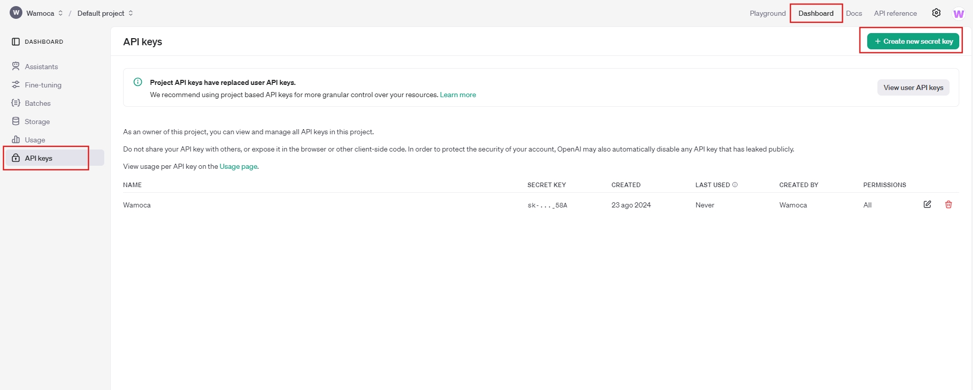 Once clicked, the first thing to do is to create an ‘API Key’, which will be the key we will use in Wamoca. To do this we will have to go to Dashboard > API keys > Create new secret key