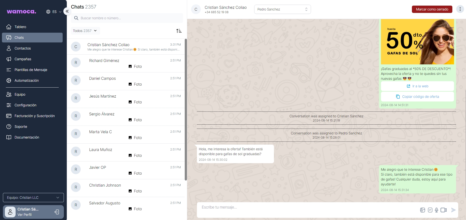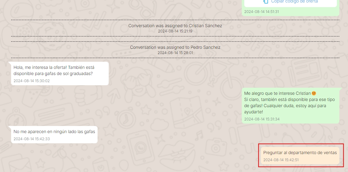 To do this, we will have to select the drop-down menu that appears at the top of the chat and select the team member. This action can only be performed by members with the ‘Manager’ role.
