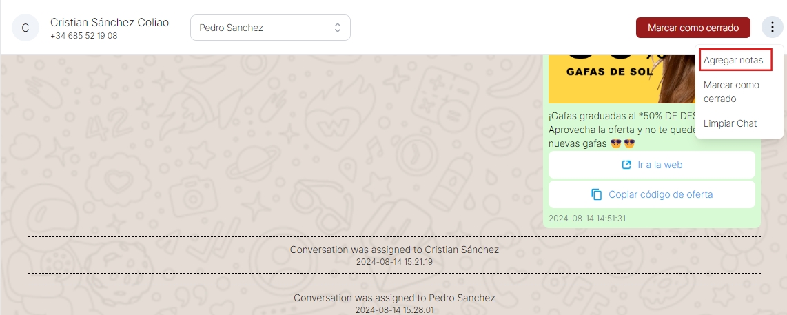 Annotations are internal notes that are stored in the chat for better customer management. To create an annotation, click on the top right button and click on ‘Add notes’: