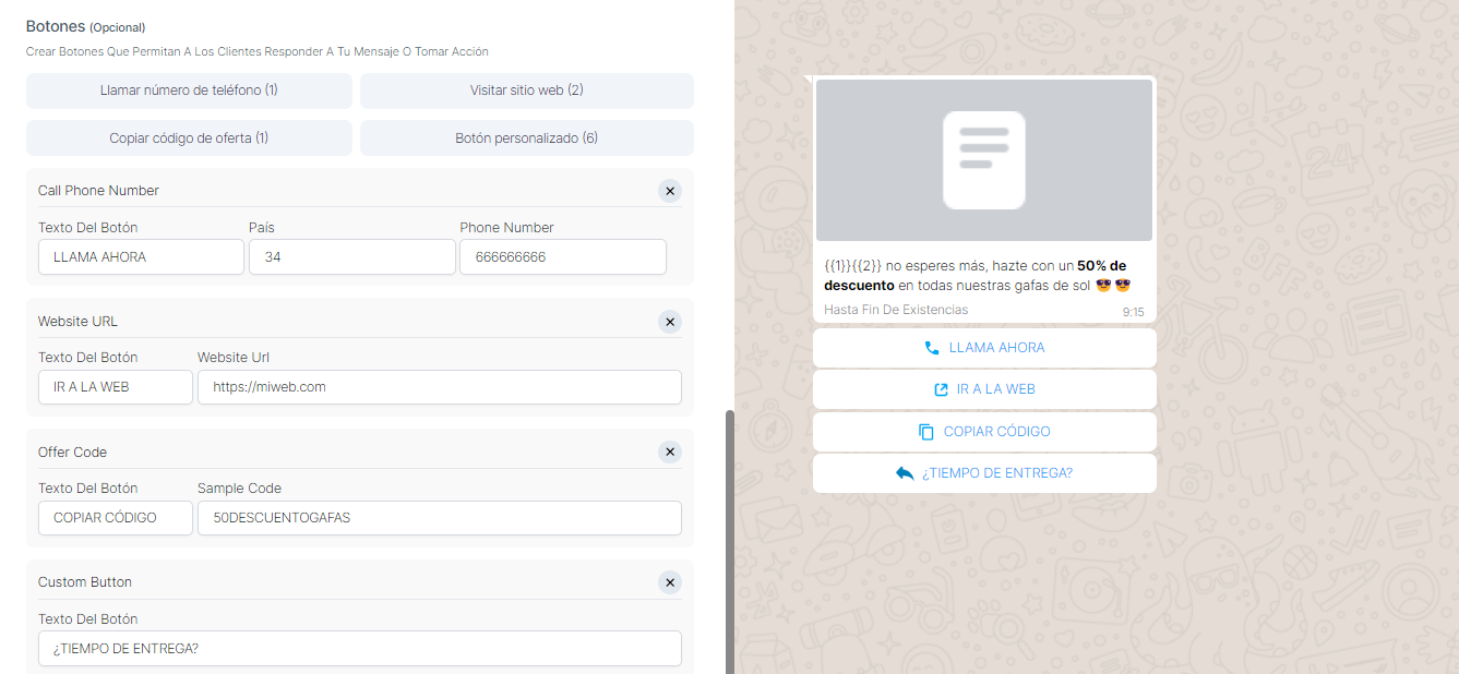 * **Custom button**: button to send message. If the customer presses the button a text message with its value will be sent (set up in the campaign). This is very useful for autoresponders