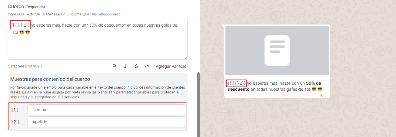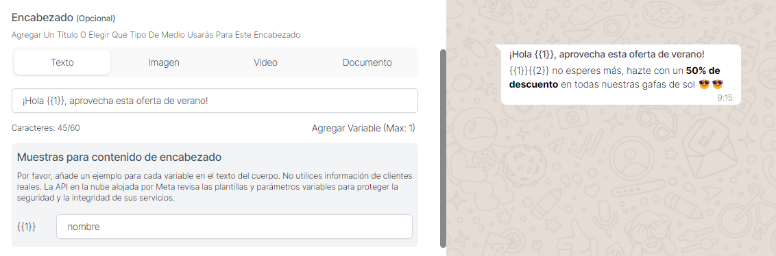 * **Text**: text field in which we can add a dynamic variable (client's name, client's surname, etc.). This dynamic variable will be configured when creating a campaign.