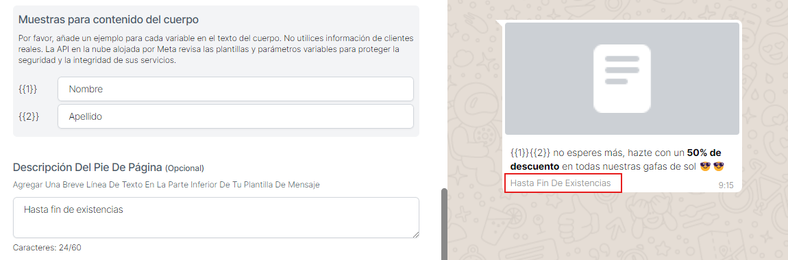<figure><img src="https://content.gitbook.com/content/SxvPYfWcDVqrKNDxK9dH/blobs/H8GR2VyRT2U2EsUrqtgo/image.png" alt=""><figcaption><p>Template message footer</p></figcaption></figure>