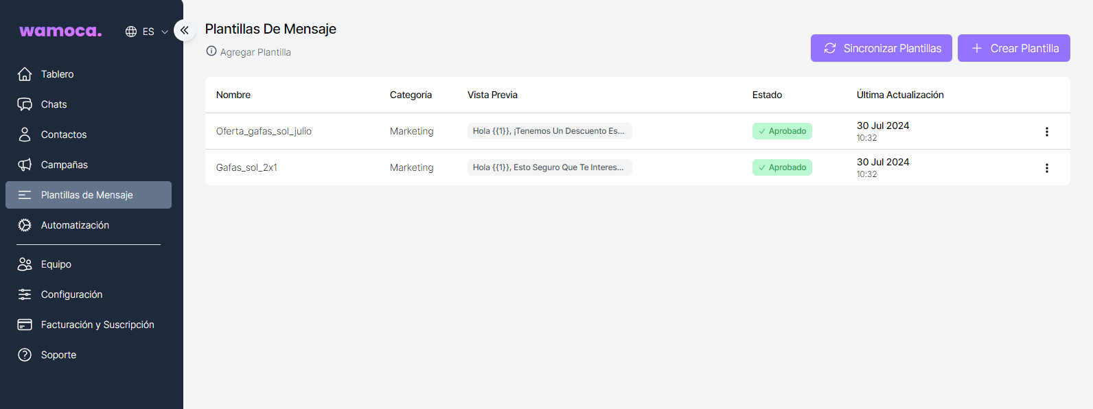 * **Status**: status of the template in WhatsApp Busines&#x73;**. WhatsApp must approve our templates before they can be sent to customers**. Statuses can be: <mark style="color:orange;">Pending</mark>, <mark style="color:green;">Approved</mark> or <mark style="color:red;">No approved</mark>