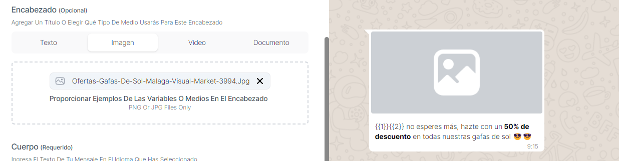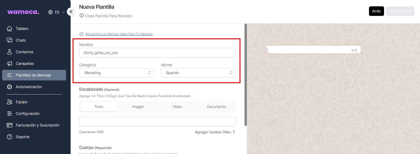* Category: there are different message categories in WhatsApp, at the moment we only allow you to create message templates from the Marketing category