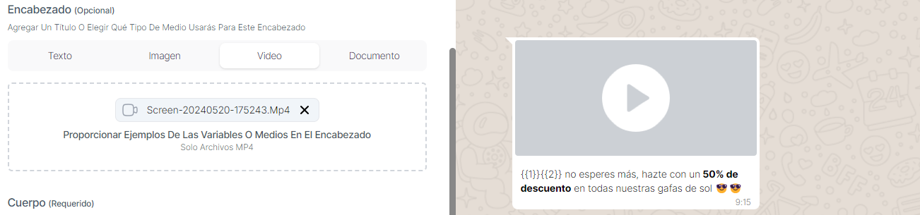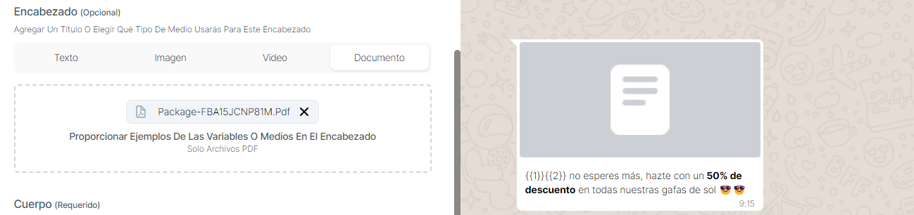 This field is the main text of the message. Here we can format the text (bold, italics, etc.) and add dynamic variables that will be configured in the campaign.