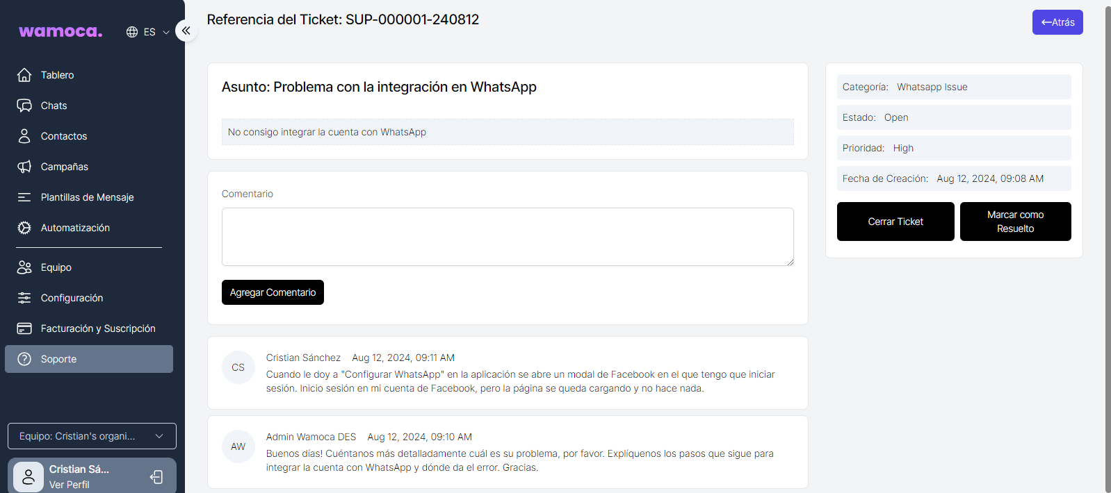On the details page you will find all the information related to the ticket. There you will be able to communicate with our support team through comments.
